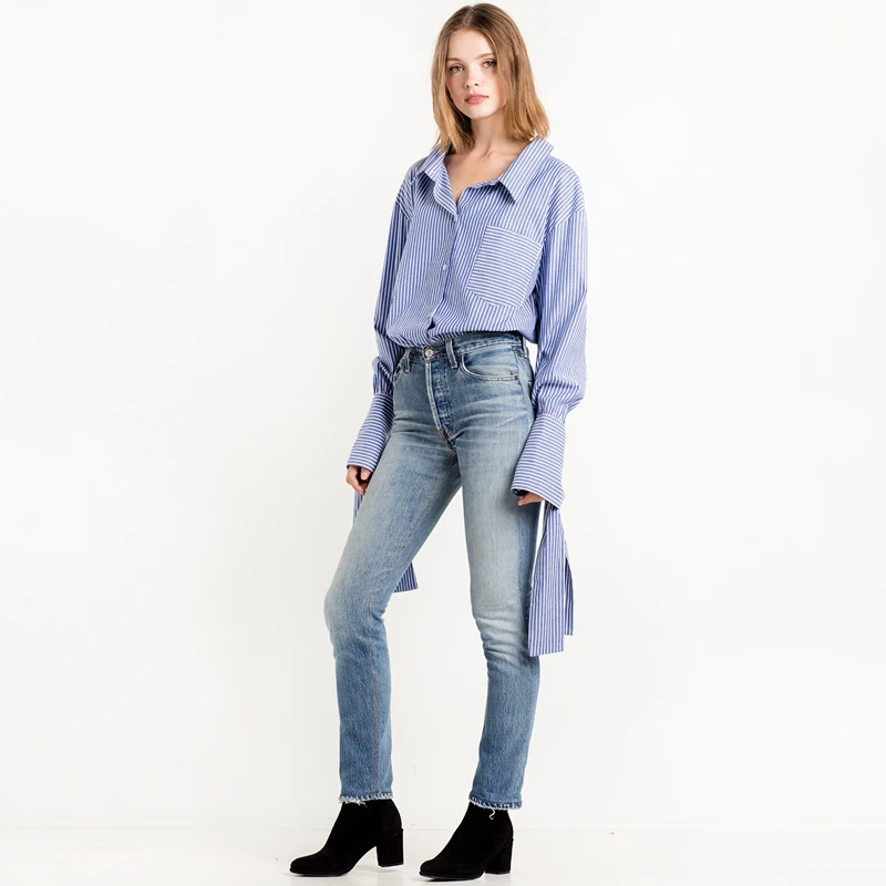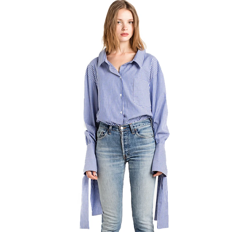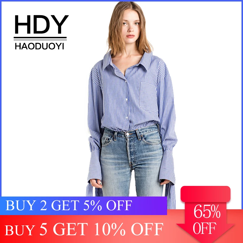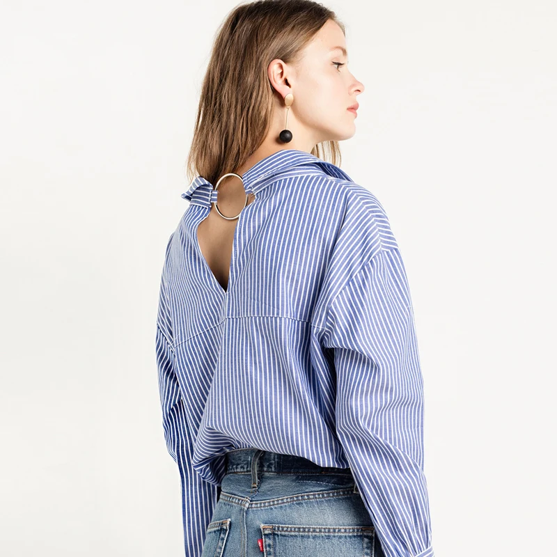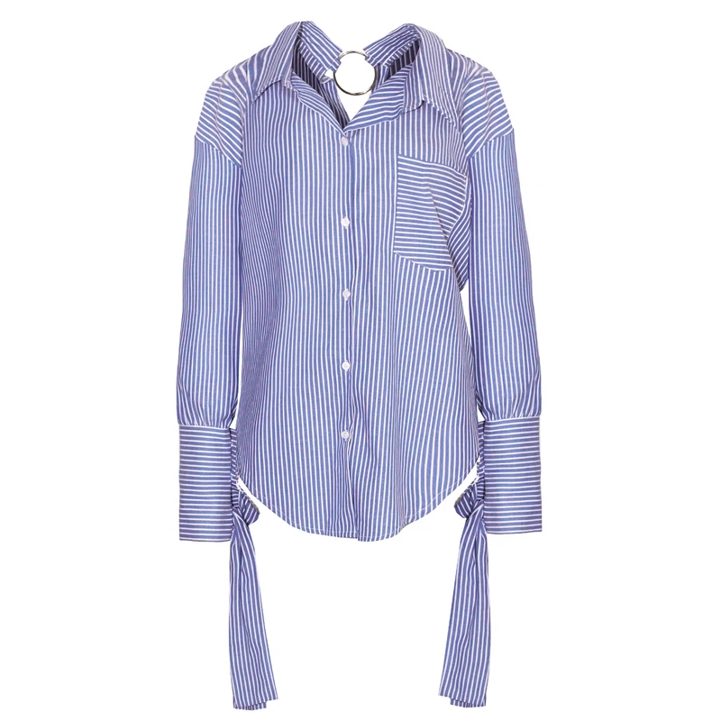 Best HDY Haoduodyi Sexy Blue Striped Chic Women Tops Elegant Casual Loose Pockets Backless Shirt Ring Ba