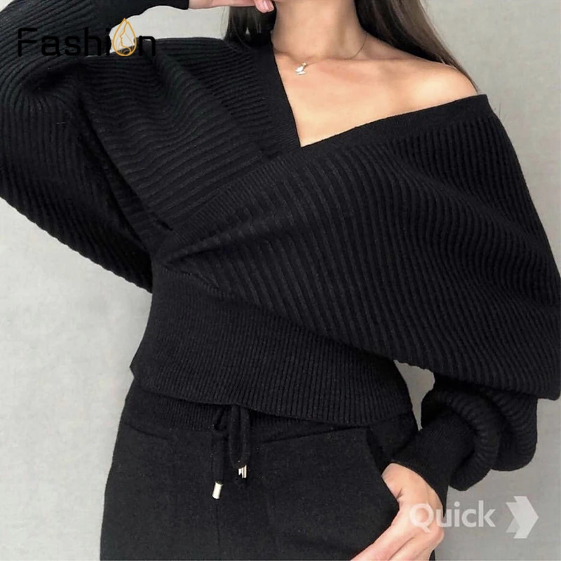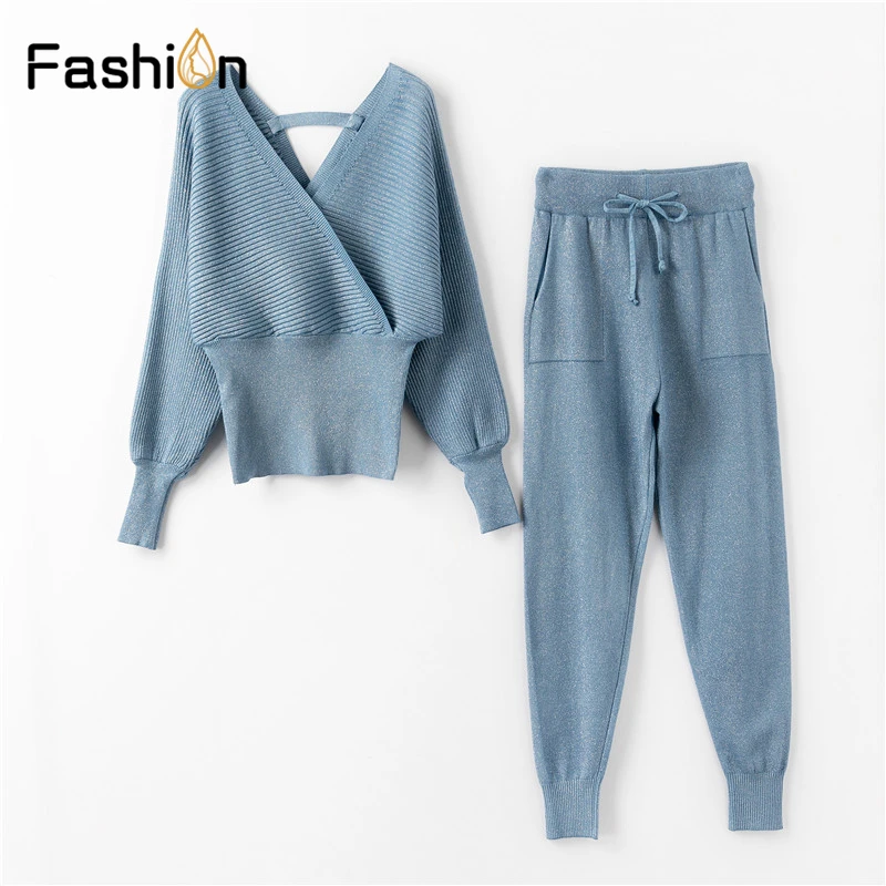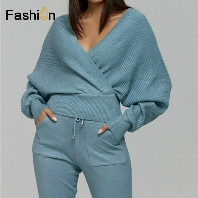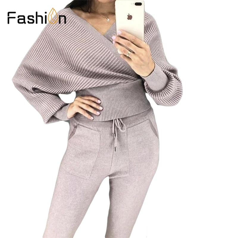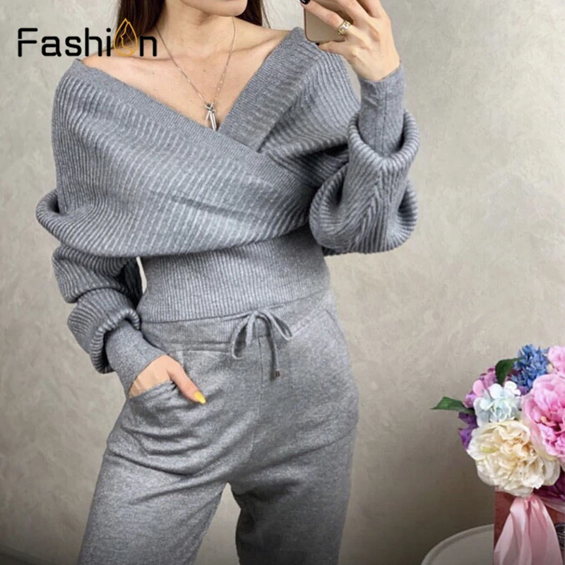 Best Women Winter Two Piece Set Knitted Warm Suit V Collar Sweater+Long Pants Knit 2 Piece Set Track Sui